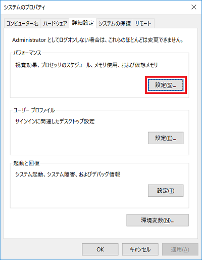 3つ目のタブ「詳細設定」を選択し、1段目のパフォーマンス欄にある「設定」をクリックします。